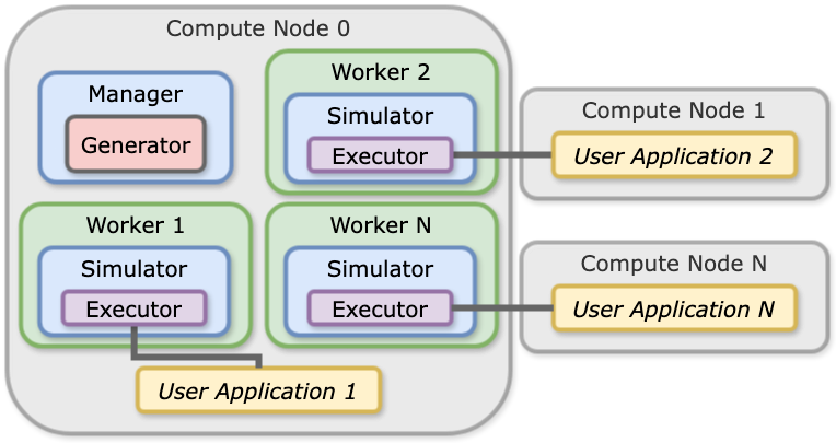 Note that while the diagrams below show one application being run per node, configurations with multiple nodes per worker or multiple workers per node are both common use cases.
