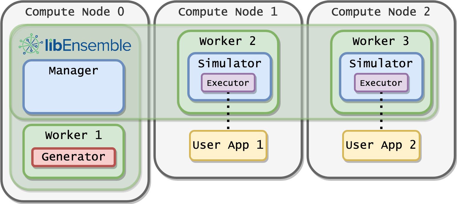 The default communications scheme places the manager and workers on the first node. The MPI Executor can then be invoked by each simulation worker, and libEnsemble will distribute user applications across the node allocation. This is the most common approach where each simulation runs an MPI application.